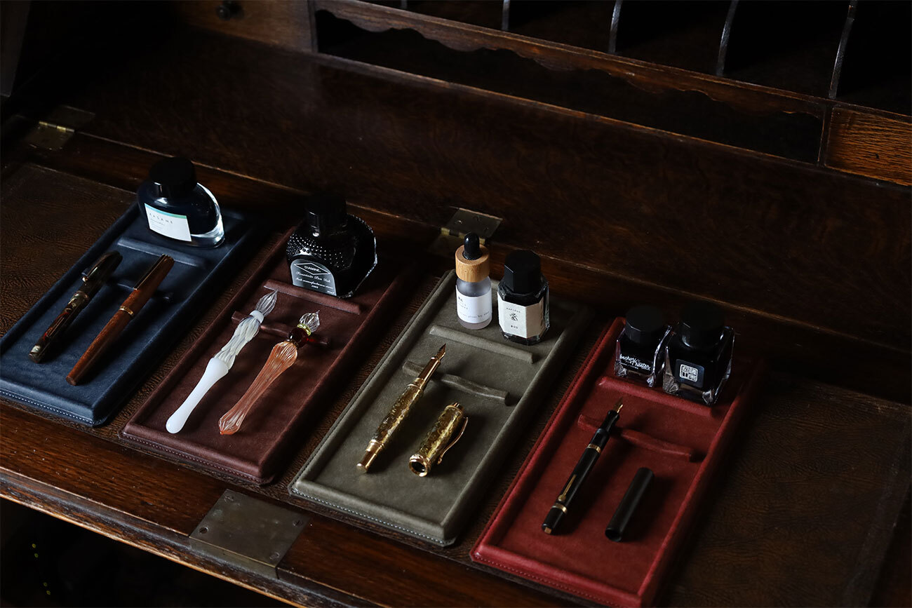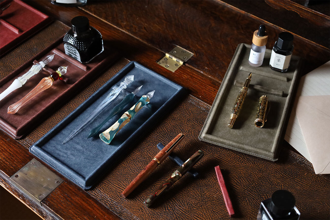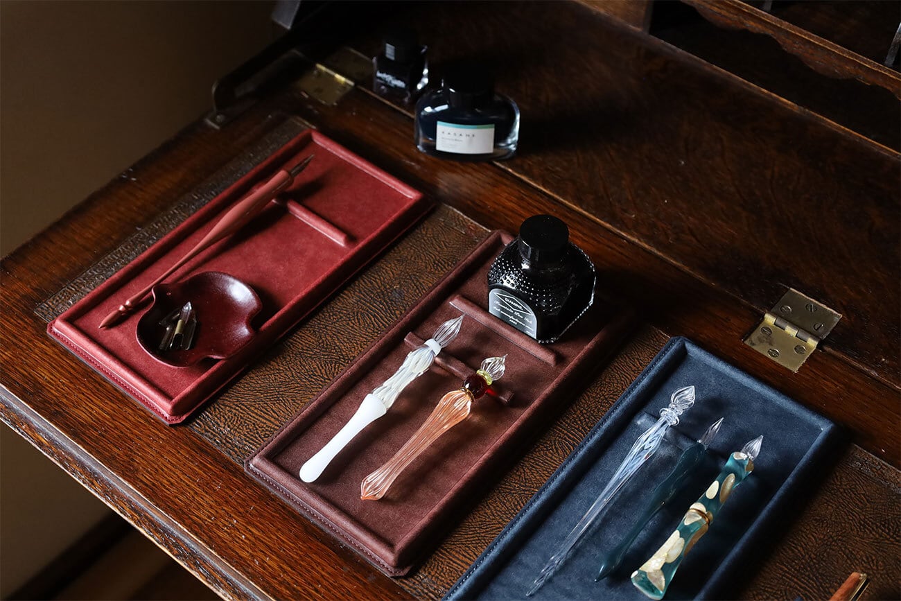 ガラスペン使用時のインク瓶やガラスペン達を、上品に安全にまとめることができます。