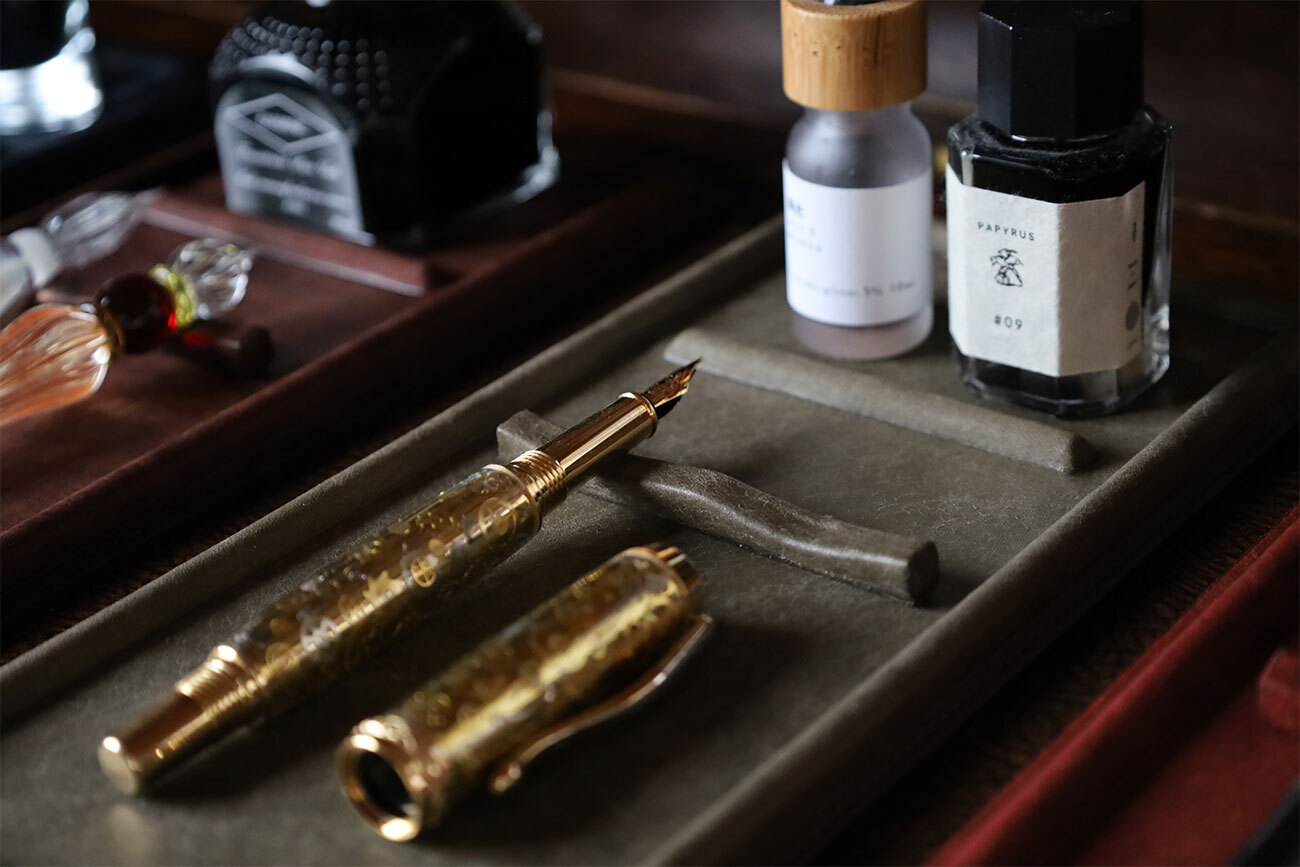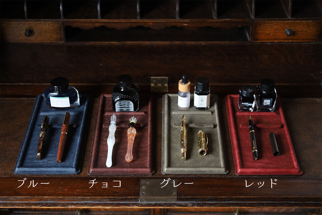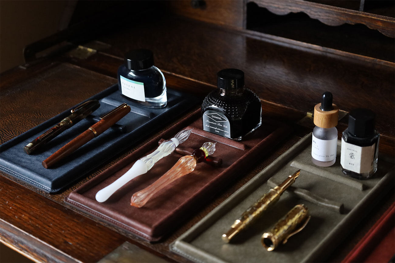 ガラスペン使用時のインク瓶やガラスペン達を、上品に安全にまとめることができます。