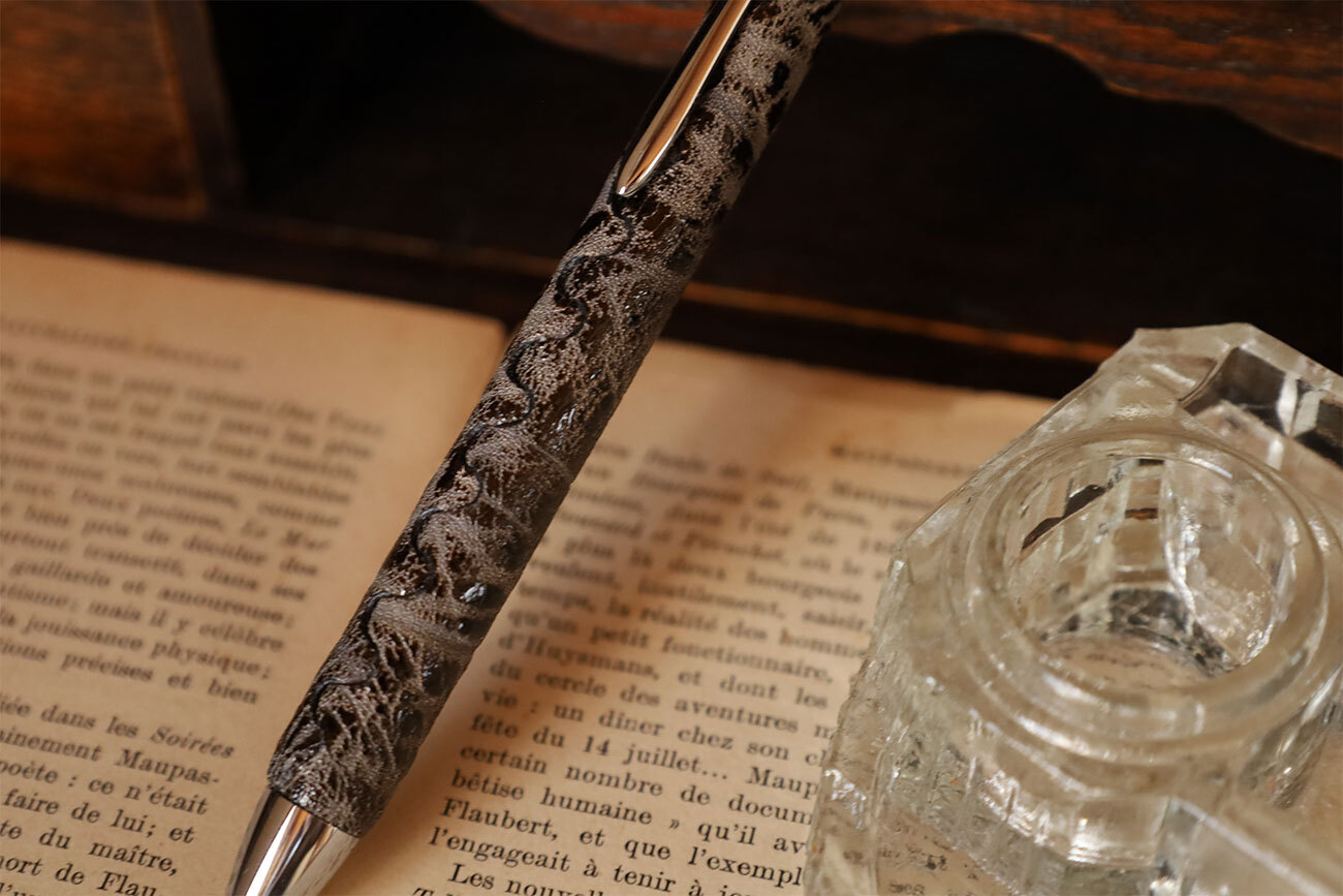 極ジュエルストーンは地球の歴史を刻んでいる雄大な峡谷、特に河川が急流の日本の峡谷とグレーの岩肌を表現するために日本の水墨画をイメージし、日本の鞣し技術と漆で表現しています。