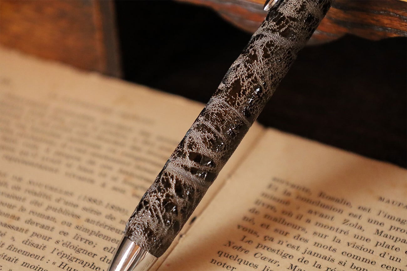 岩のような革をイメージし漆を施したもの。